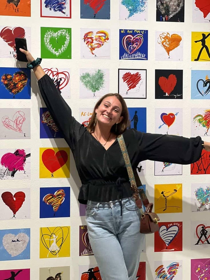 Samantha devant un mur de collages qu’elle a elle-même réalisé.